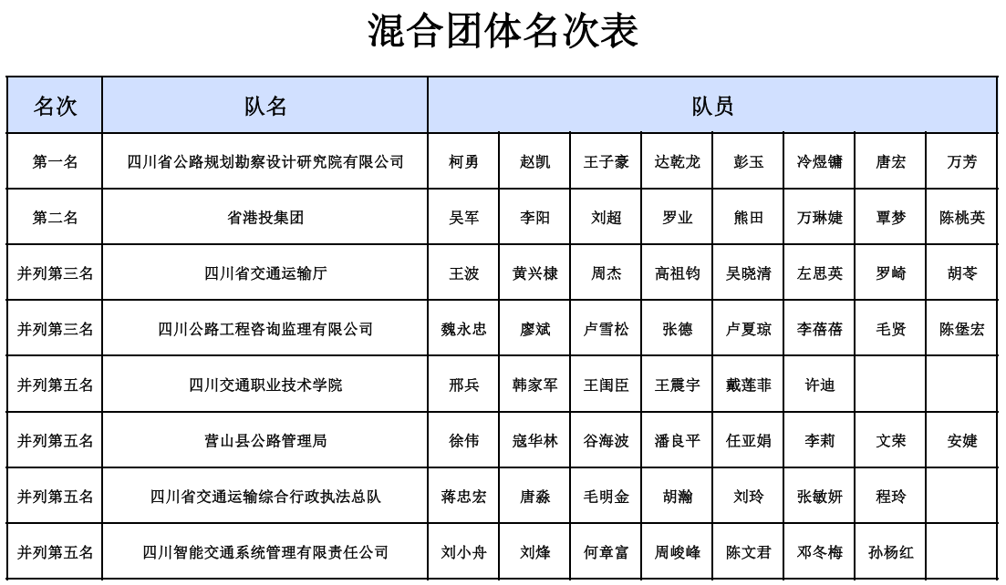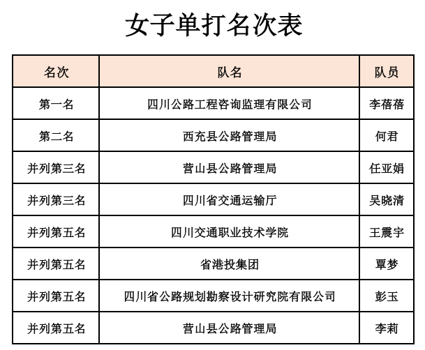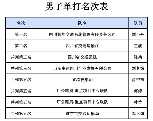 厅安全总监王波出席比赛开幕式,来自交通运输工会系统的22支代表队、200余人参赛。经过两天的激烈角逐,男子单打、女子单打、混合团体赛三个项目分别决出了前八名,刘小舟、李蓓蓓分获男单、女单冠军,省公路设计院公司代表队摘得混合团体桂冠,营山县公路局代表队荣获“道德风尚奖”。