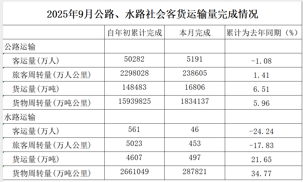 下载附件:2025年9月公路、水路社会客货运输量完成情况