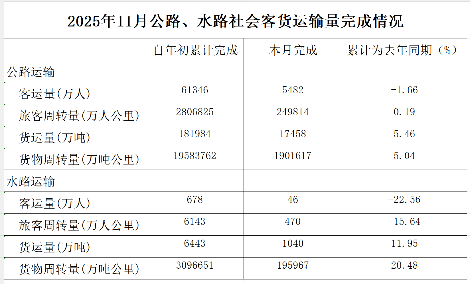 下载附件:2025年11月公路、水路社会客货运输量完成情况