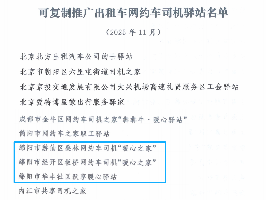 近日,交通运输部办公厅与中华全国总工会办公厅联合印发《关于公布2025年可复制推广出租车网约车司机驿站项目的通知》,在全国范围内评选出100个可复制、可推广的司机驿站优秀项目。绵阳市游仙区桑林网约车司机“暖心之家”、经开区板桥网约车司机“暖心之家”、涪城区华丰社区跃享暖心驿站等3家司机驿站成功入选,绵阳市在交通运输行业新就业群体服务保障方面取得新突破、迈上新台阶!