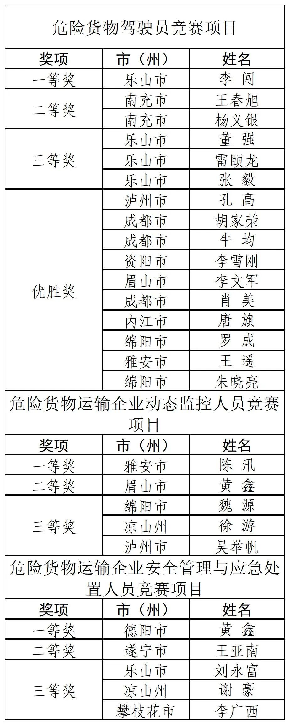 此次竞赛,共有来自全省的21支代表队、90名选手分别在危货驾驶员、危货运输企业动态监控人员、危货运输企业安全管理与应急处置人员3个赛项中展开激烈比拼,竞赛采用理论知识考试与现场操作相结合的方式,全面检验从业人员的专业能力和应急处置水平。经过紧张角逐,3个赛项共26名选手凭借扎实的专业功底和出色的应变能力脱颖而出。乐山市代表队、南充市代表队及雅安市代表队等3个代表队获得优秀组织奖。