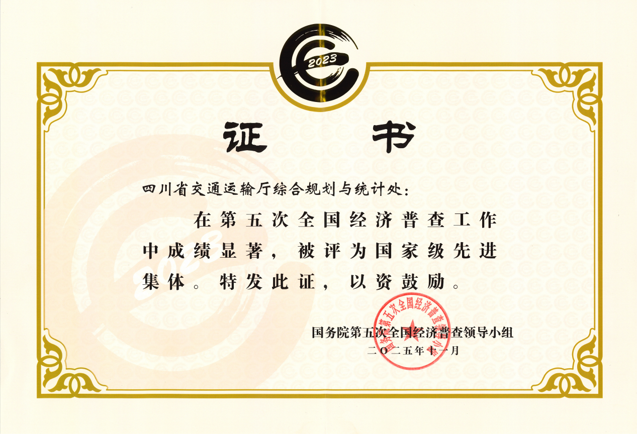 近日,第五次全国经济普查总结表彰会在北京举行,四川省交通运输厅综合规划与统计处被国务院第五次全国经济普查领导小组办公室表彰为“第五次全国经济普查先进集体”,是全国交通运输行业唯一获此殊荣的集体,也是四川省级部门中仅有的两家之一。