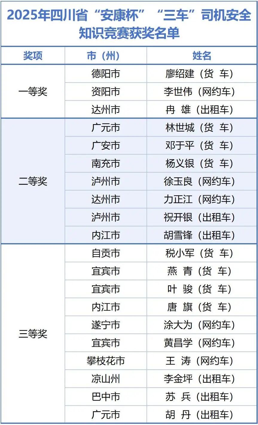 为深入贯彻落实习近平总书记关于安全生产的重要论述和重要指示批示精神,坚守“人民至上、生命至上”理念,充分发挥“安康杯”竞赛在安全生产宣传教育中的引领作用,切实提升全省货车、网约车、出租车司机的安全意识、业务技能与应急处置能力,四川省交通运输厅、四川省总工会联合主办,四川省交通运输工会、四川省交通运输厅道路运输管理局承办了2025年四川省“安康杯”“三车”司机安全知识竞赛。本次竞赛于12月19日圆满闭幕。