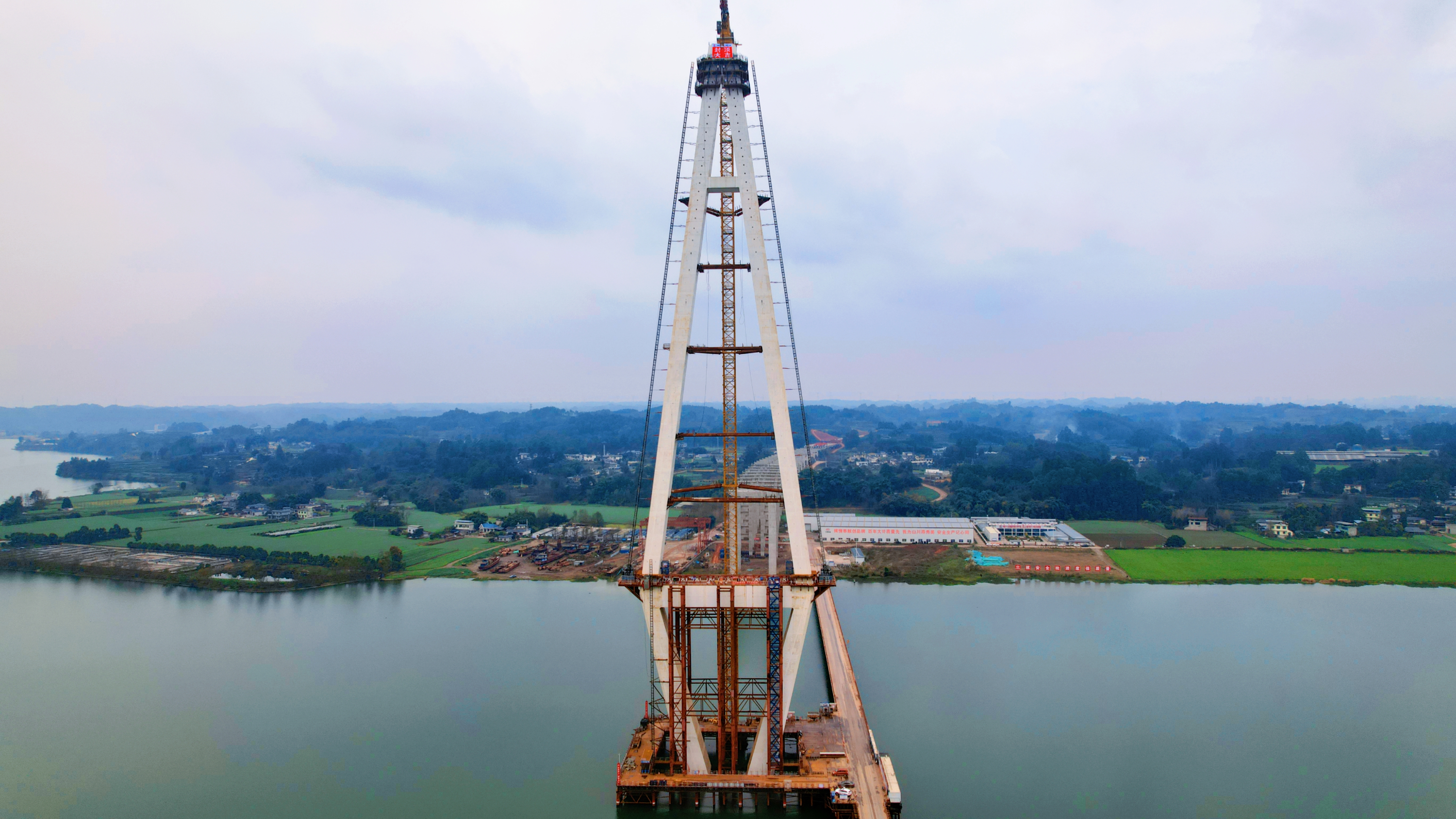 1月4日,随着最后一节索塔钢壳节段精准吊装就位,全线控制性节点工程——汉阳湖岷江特大桥主塔顺利封顶,标志着项目建设取得重大进展。