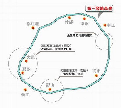 串起成都、德阳、资阳、眉山等14个区(市)县,被市民称作“三绕”的成都经济区环线高速,目前又有了新进展。于2014年最先开建的南段(简阳至蒲江段),主体有望在年内建成,而成都境内的金堂段已经正式启动建设。此外,西段(蒲江至都江堰段)已经公示环评,建设提上日程。