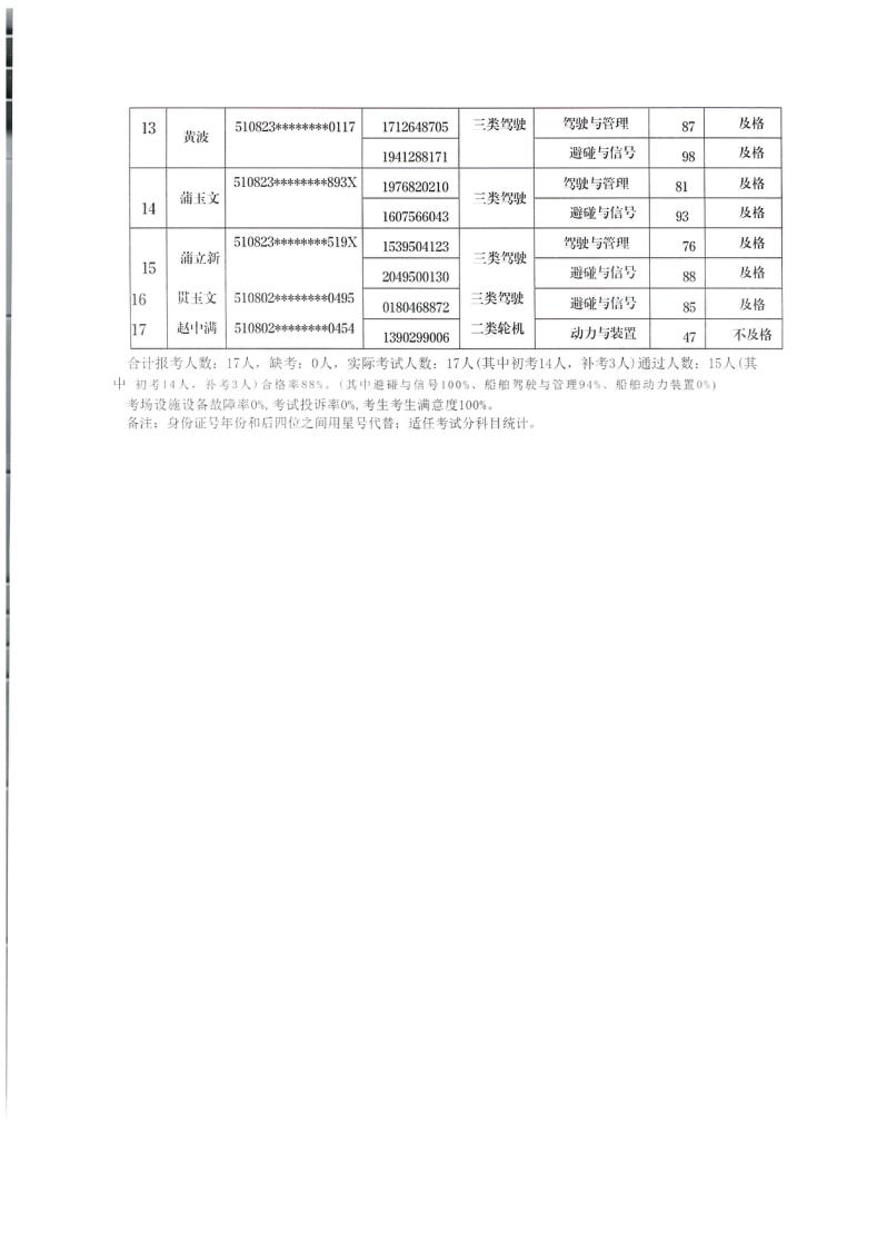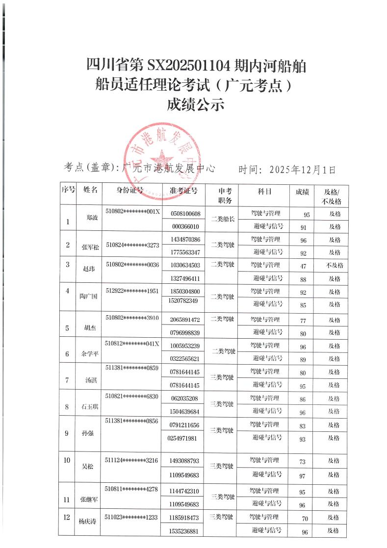 四川省第SX20251104期内河船舶船员适任理论考试(广元考点)成绩公示