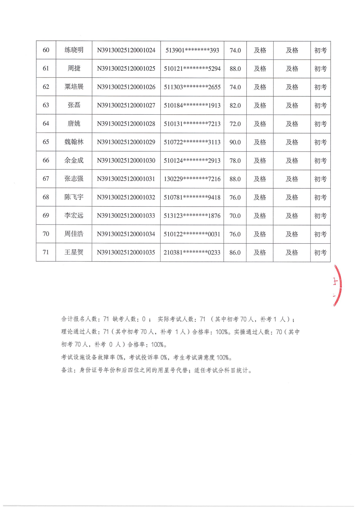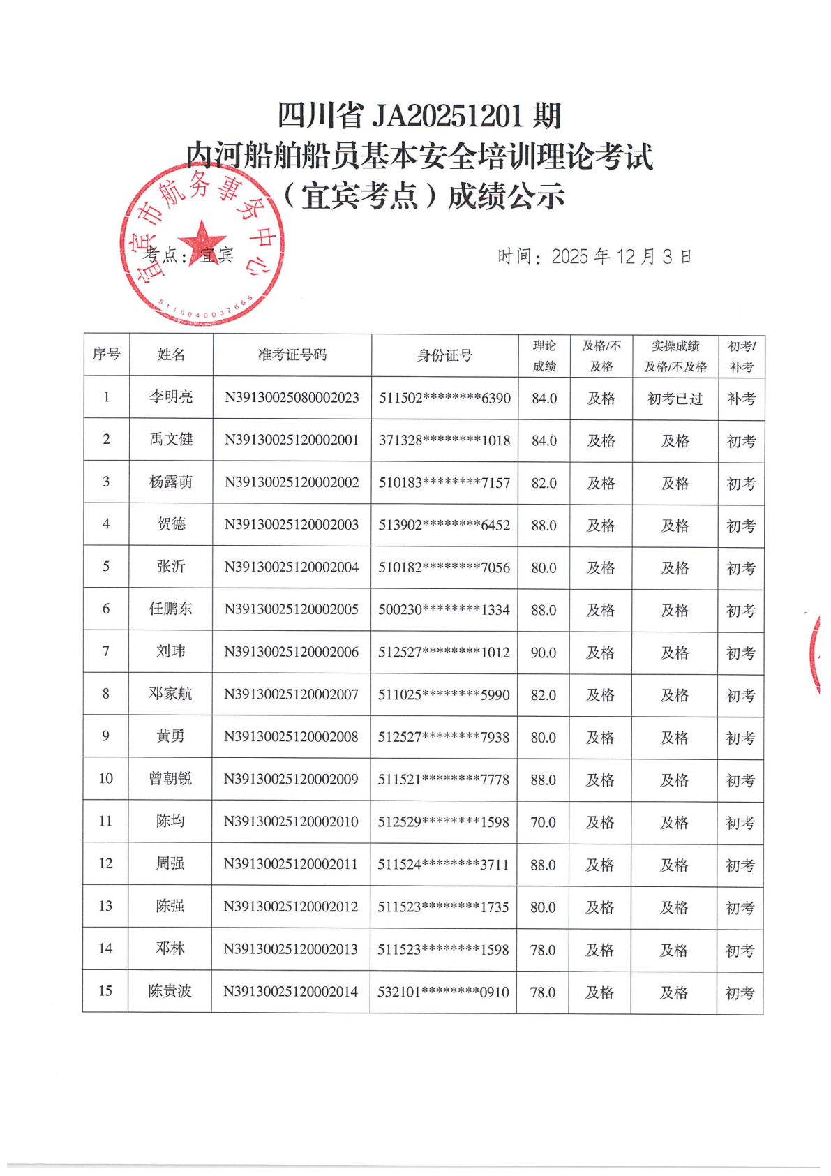 四川省JA20251201期内河船舶船员基本安全培训理论考试(宜宾考点)成绩公示