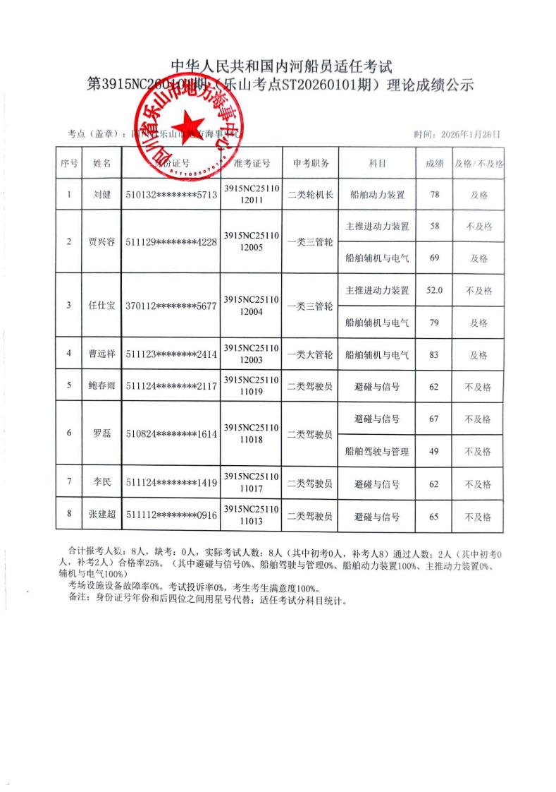 四川省第ST20260101期内河船舶船员岗位适任理论考试(乐山考点)成绩公示