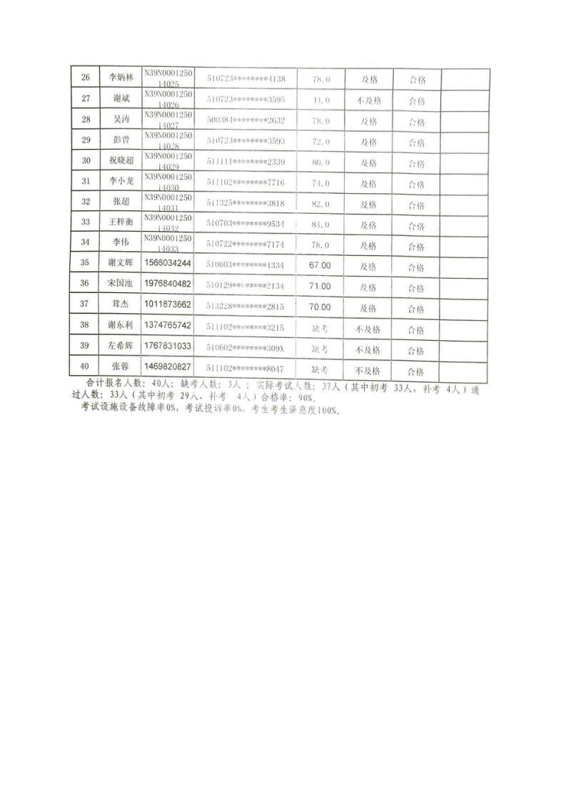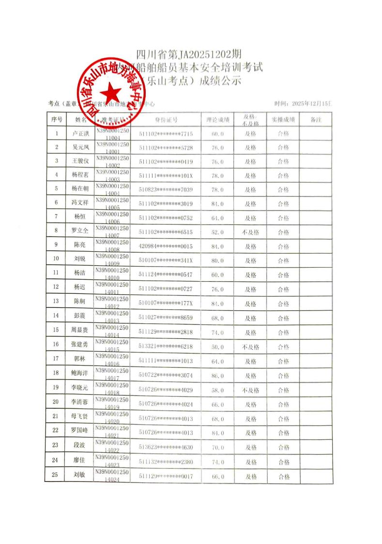 四川省JA20251202期内河船舶船员基本安全培训理论考试(乐山考点)成绩公示