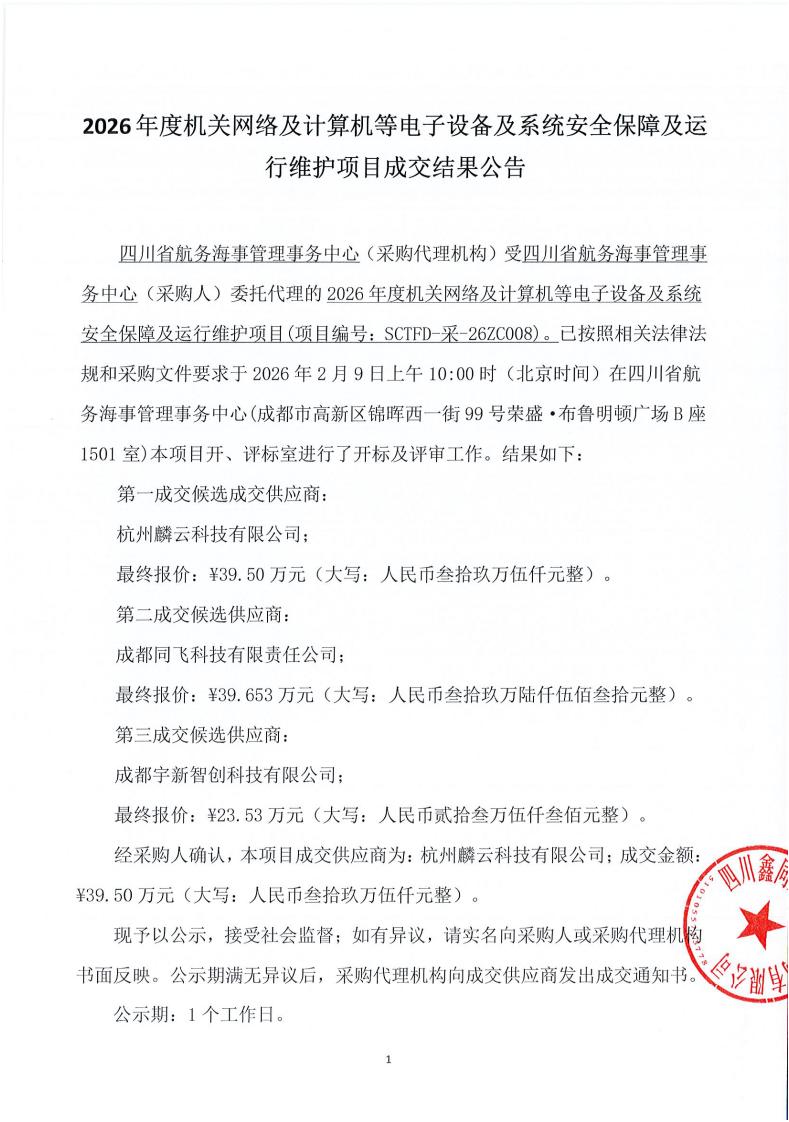 2026年度机关网络及计算机等电子设备及系统安全保障及运行维护项目成交结果公告
