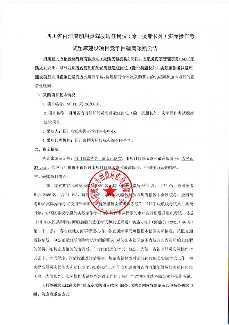 四川省内河船舶船员驾驶适任岗位(除一类船长外)实际操作考试题库建设项目竞争性磋商采购公告