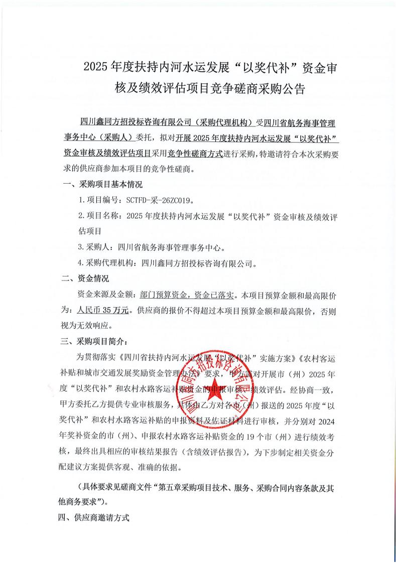 2025年度扶持内河水运发展“以奖代补”资金审核及绩效评估项目竞争磋商采购公告
