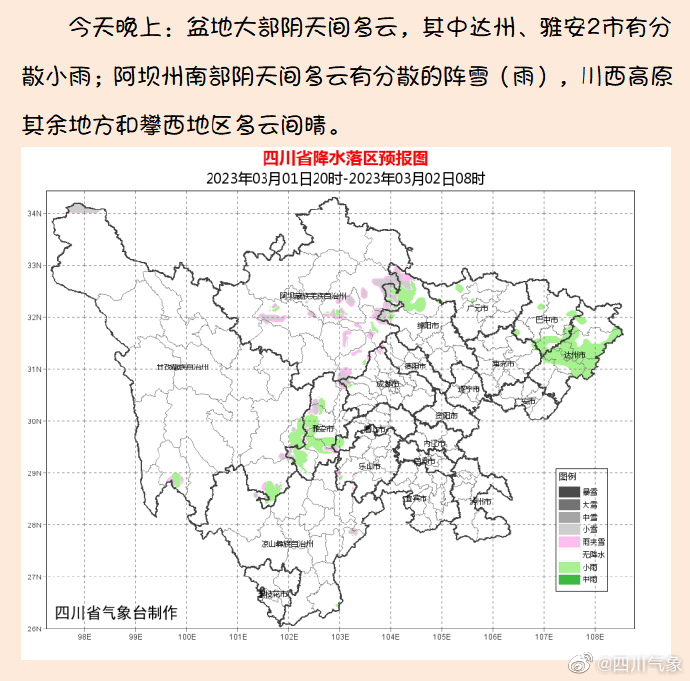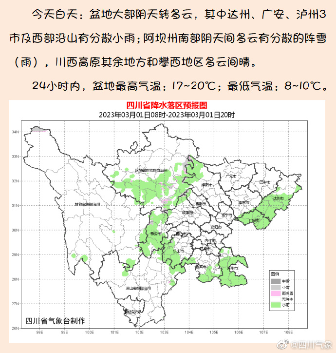 今天白天到晚上:盆地大部阴天转多云,其中达州、广安、泸州3市及西部沿山有分散小雨;阿坝州南部阴天间多云有分散的阵雪(雨),川西高原其余地方和攀西地区多云间晴