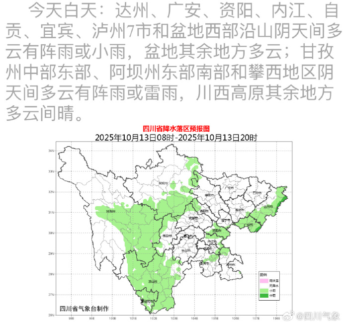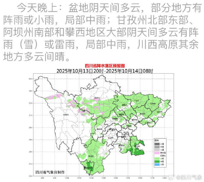 今天白天到晚上:盆地阴天间多云,部分地方有阵雨或小雨,局部中雨;甘孜州北部东部、阿坝州东部南部和攀西地区阴天间多云有阵雨(雪)或雷雨,局部中雨,川西高原其余地方多云间晴。24小时内,盆地最低气温:15~18℃;最高气温:西部23~25℃,其余地方21~23℃。