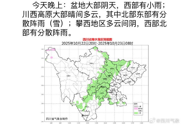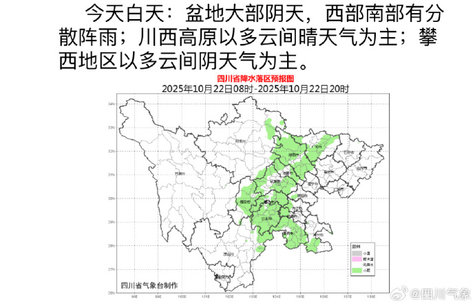 今天白天到晚上:盆地大部阴天,西部南部有阵雨或小雨;川西高原大部晴间多云,其中北部东部有分散阵雨(雪);攀西地区多云间阴,西部北部有分散阵雨。24小时内,盆地最低气温:11~14℃;最高气温:西部14~16℃,其余地方16~19℃。