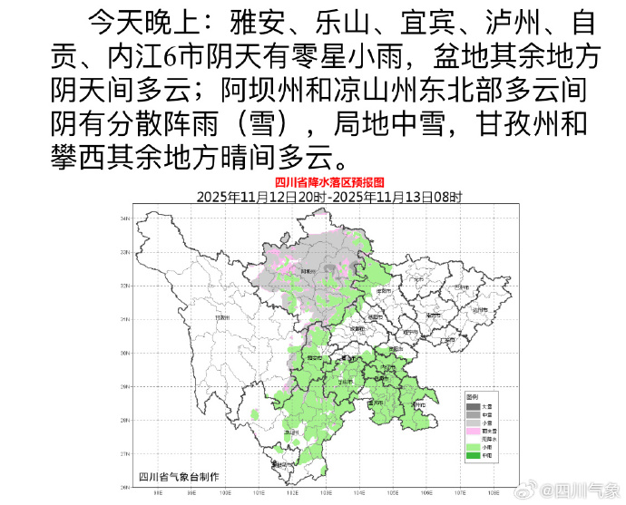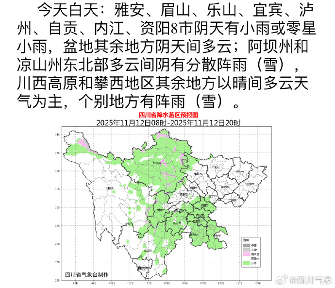 今天白天到晚上:雅安、眉山、乐山、宜宾、泸州、自贡、内江、资阳8市阴天有小雨或零星小雨,盆地其余地方阴天间多云;阿坝州和凉山州东北部多云间阴有阵雨(雪),局地中雪,川西高原和攀西地区其余地方以晴间多云天气为主,个别地方有阵雨(雪)。24小时内,盆地最低气温:西北部9~11℃,其余地方12~14℃;最高气温:北部18~21℃,其余地方16~18℃。
