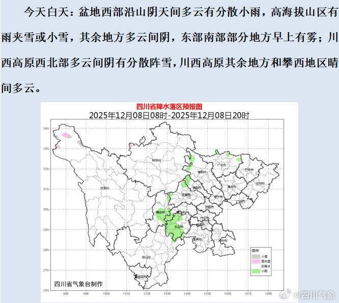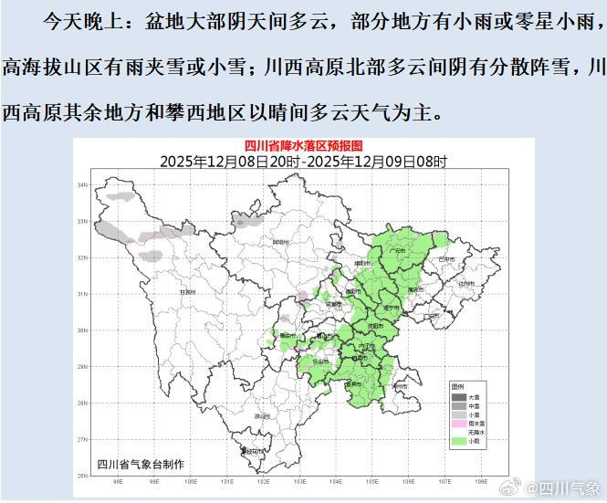 今天白天到晚上:盆地大部多云转阴有小雨或零星小雨,高海拔山区有雨夹雪或小雪,东部南部部分地方早上有雾;川西高原北部多云间阴有分散阵雪,川西高原其余地方和攀西地区以晴间多云天气为主。24小时内,盆地最低气温:北部5~8℃,其余地方7~10℃;最高气温:西部14~15℃,其余地方16~18℃。