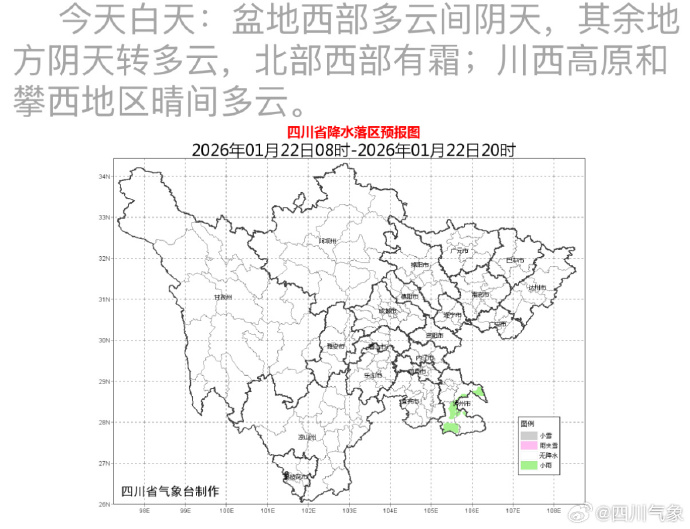 今天白天到晚上:盆地西部多云间阴天,其余地方阴天转多云,北部西部有霜;川西高原和攀西地区晴间多云。24小时内,盆地最低气温:北部-1~2℃,其余地方2~4℃;最高气温:7~10℃。