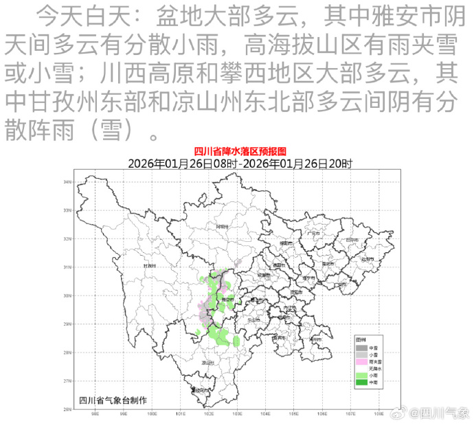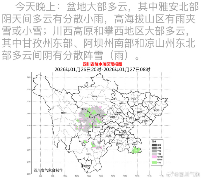 今天白天到晚上:盆地大部多云,其中雅安市阴天间多云有分散小雨,高海拔山区有雨夹雪或小雪;川西高原和攀西地区大部多云,其中甘孜州东部、阿坝州南部和凉山州东北部多云间阴有分散阵雪(雨),局部中雪。24小时内,盆地最低气温:西部2~4℃,其余地方3~6℃;最高气温:12~15℃。