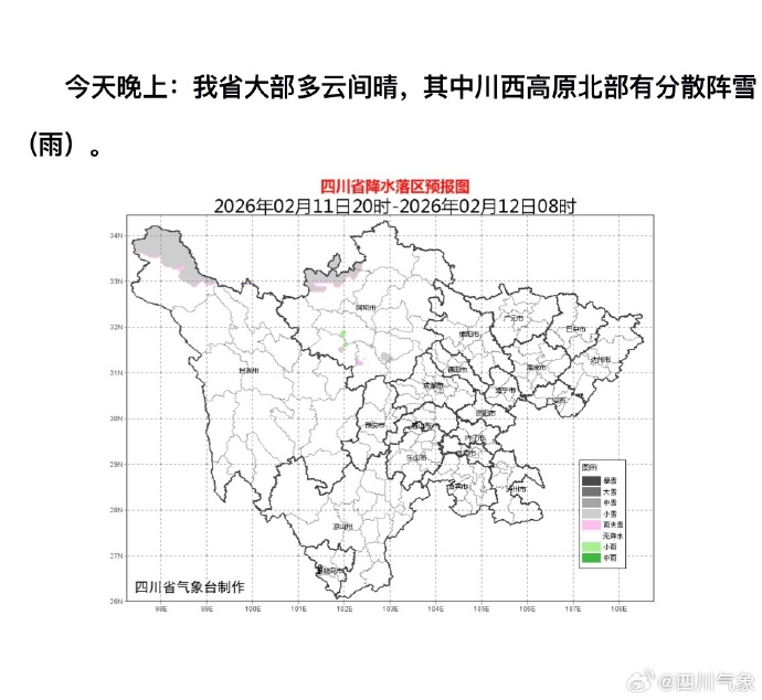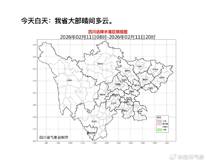 今天白天到晚上:我省大部以多云间晴天气为主,其中川西高原北部有分散阵雪(雨)。24小时内,盆地最低气温:西北部1~3℃,其余地方3~5℃;最高气温:15~17℃。