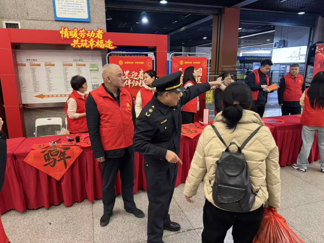 活动现场,志愿者们主动靠前,为往来旅客提供出行咨询、票务协助、行李搬运、暖心姜汤等一站式便民服务,为返乡务工人员、老人、学生等重点旅客提供帮扶指引,引导大家安全顺畅出行。在贴心服务的同时,现场还精心设置了新春文化互动环节,局内书法爱好志愿者们挥毫泼墨,为旅客书写春联、题写福字,还有非遗传承人现场制作糖画、剪纸等传统手工艺品,将地道年味与新春祝福送到过往旅客手中。即将乘车返回武汉的王女士举着刚写好的“福”字笑着表示:“还是手写春联有年的味道,我要把这份福气带回家,过年贴起来!”