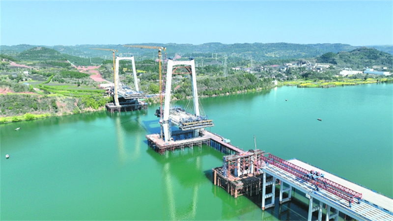 3月27日,在成南高速公路扩容工程(南充段)嘉陵江特大桥施工现场,只见一排排桥墩矗立于嘉陵江上,大桥主塔已全面封顶,工人们正在进行主梁的预应力张拉、桥面清理等工作,处处是热火朝天的建设场景。