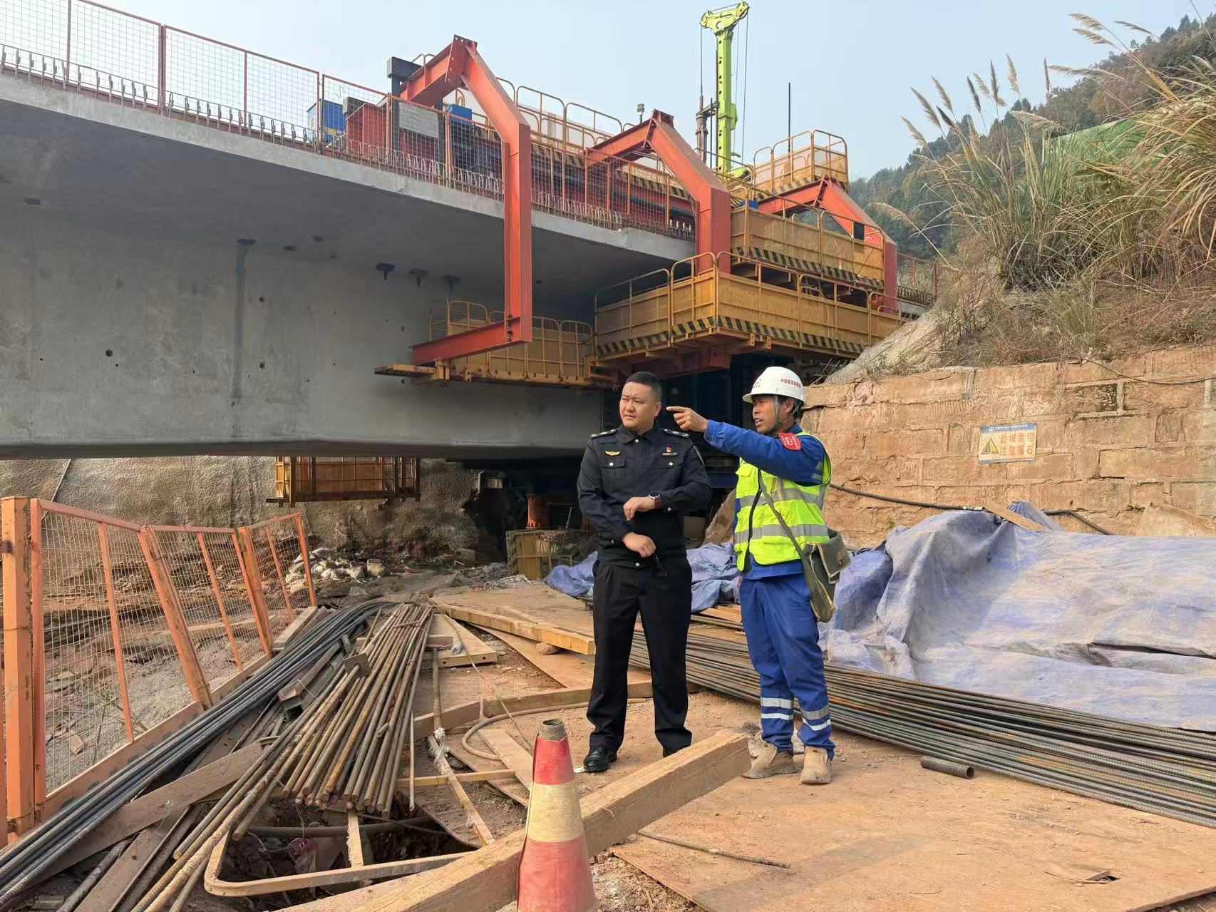 为做好辖区G76厦蓉高速公路成都段2026年元旦节期间安全生产工作,近日,交通执法一支队三大队开展节前涉路施工监管,重点督导检查新建成渝中线铁路(四川段)站前工程CYZXZQ-3标项目跨越G76厦蓉高速公路成渝段K2119+300路基施工,实地查看施工区域安全防护设施、警示标志设置及人员安全防护等情况,指出存在的问题和不足。强调:一是应停止涉及高速公路边网以内或者投影在边网以内的施工作业;二要做好元旦节期间施工场地内设施设备、人员安全管理,禁止施工人员随意进入高速公路,塔吊设备停用时应与高速公路平行,塔吊投影禁止侵入高速公路车道净空,有效防范化解施工路段安全风险,为元旦期间高速公路安全有序通行筑牢防线。同时,执法人员还开展“送法进工地”活动,普及高速公路安全法律法规。