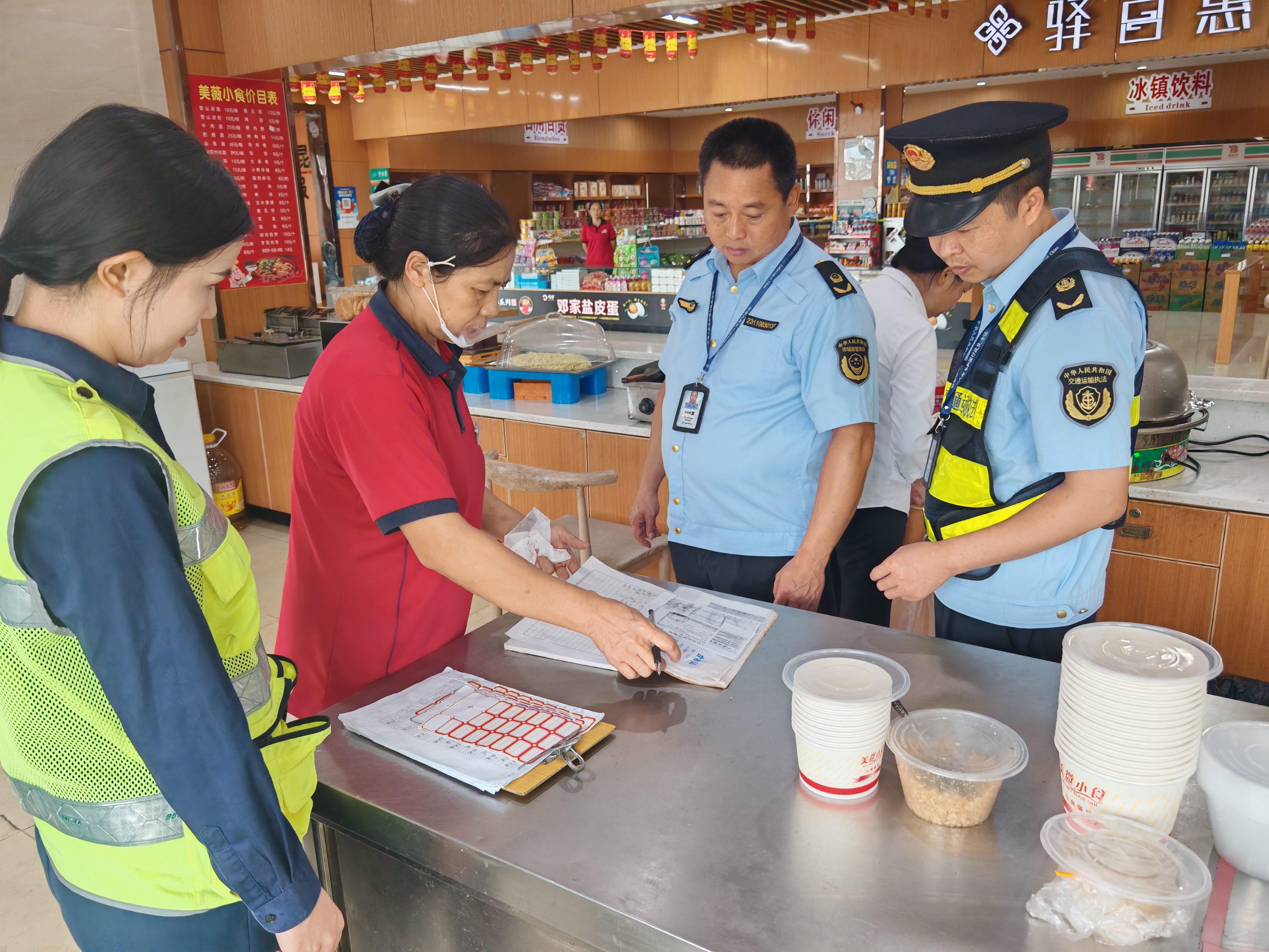 9月29日,省交通执法总队第七支队十七大队联合营山县市场监督管理局,深入G85银昆高速公路巴南广段营山服务区开展国庆中秋节前食品安全检查工作。重点围绕从业人员健康证、食品保质期、储存环境及原材料溯源等情况进行检查,指出存在的问题及不足,要求:一是加强自查自纠,杜绝销售“三无”及过期商品;二是强化食品制作及储存管理,严守食品安全底线。三是加大基础食品和油料等物资储备,提升服务保障能力;四是加强服务区日常经营管理,做好设施设备维护,为司乘提供良好的出行环境。