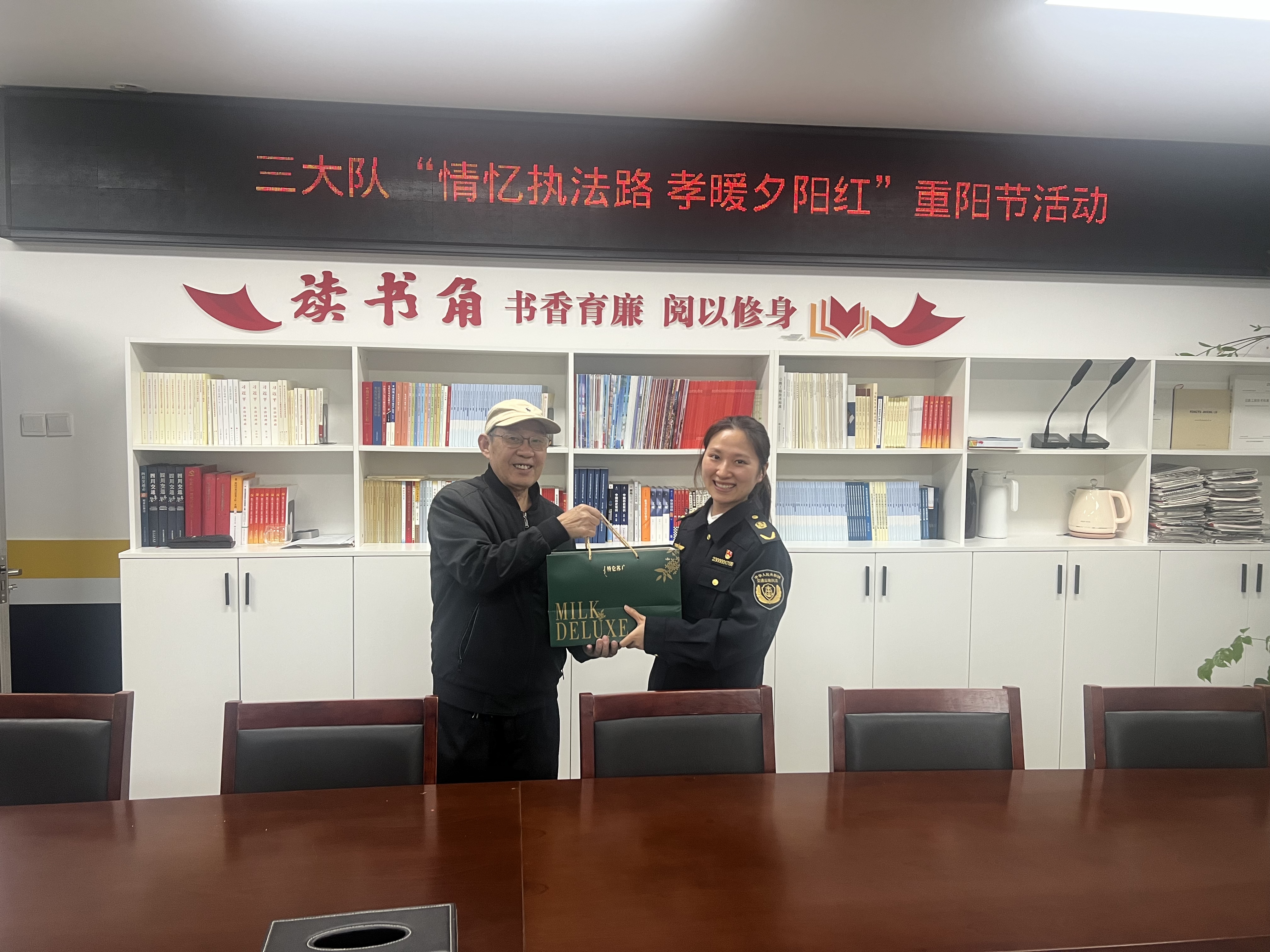 为弘扬中华民族尊老敬老传统美德,10月29日,省交通执法总队第一支队三大队开展“情忆执法路 ,孝暖夕阳红”重阳节主题活动。大队干部职工分组走访慰问退休老执法人员,送上米、牛奶等慰问品,细致询问老同志们的身体与生活状况,认真聆听前辈们讲述早年执法故事与奋斗历程。同时,老同志们还结合自身经验为大队发展建言献策。执法人员还向老同志普及高速安全出行知识,提醒日常出行及消防安全注意事项,让退休老同志感受到组织温暖。