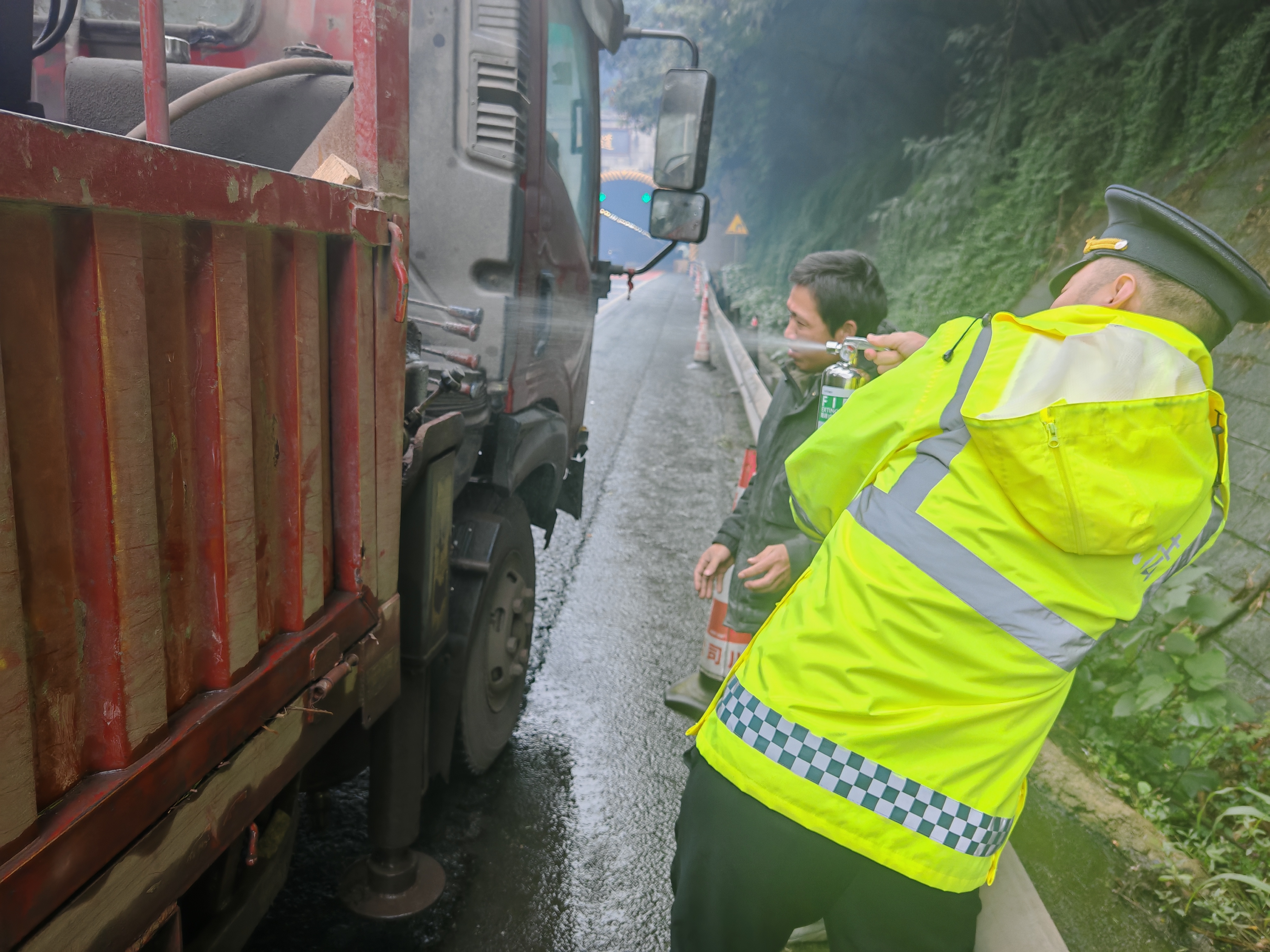 11月12日下午,交通执法一支队十一大队巡查发现G85银昆高速宜宾段宜水向K1500+200处一蓝牌二轴货车在行驶途中突然自燃,火势较大。危急时刻,执法人员迅速响应,一场与时间赛跑的救援即刻展开。一边紧急联系监控中心呼叫消防救援,一边摆放锥形桶设置警戒区域,防止过往车辆避让不及时造成二次安全事故。同时,利用随车携带的灭火器控制火势蔓延,为消防车到场争取关键时间。终于,在执法人员与消防救援部门的合力处置下,火势被成功扑灭,现场无人员受伤,最大程度减少了群众财产损失。交通执法用快速反应、高效处置筑牢辖区安全防线,用实际行动诠释“执法为人民”的初心使命!