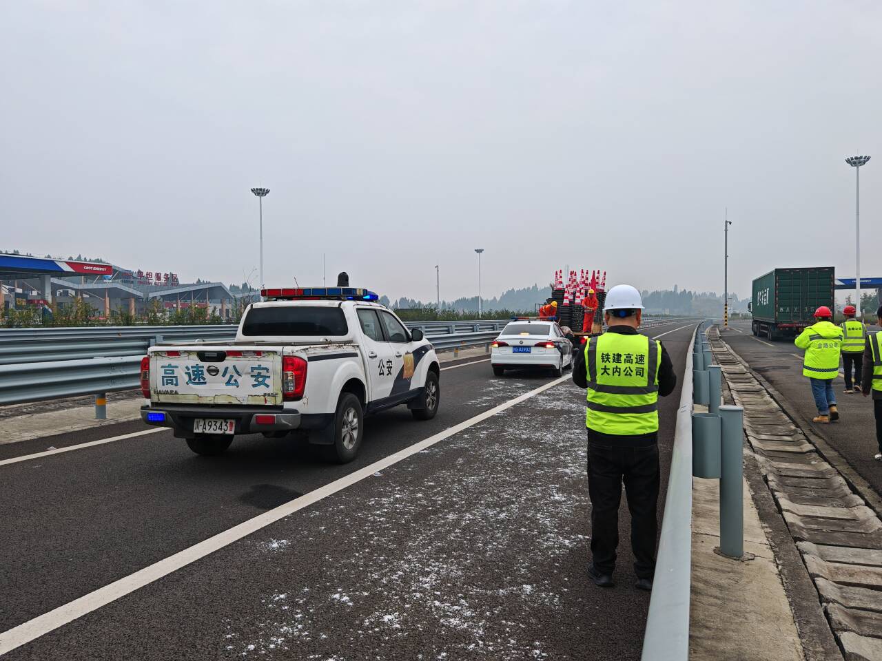 12月17日,交通执法一支队五大队联合高速交警、营运公司在S56内大高速平坦服务区开展抗冰除雪应急演练。演练模拟因气温下降,S56内大高速K1+700路段形成积雪结冰情形,“一路三方”立即启动抗冰除雪应急预案,出动人力、车辆开展抛洒融雪剂作业,快速融雪除冰,疏导交通,全力保障道路安全畅通。通过此次演练,有效提高了联勤应急队伍的实际作战能力,提升了各单位联勤联动的工作效率,达到了以演促练、检验预案、锻炼队伍的目的,为应对冬季冰雪恶劣天气高速公路保畅奠定良好的基础。