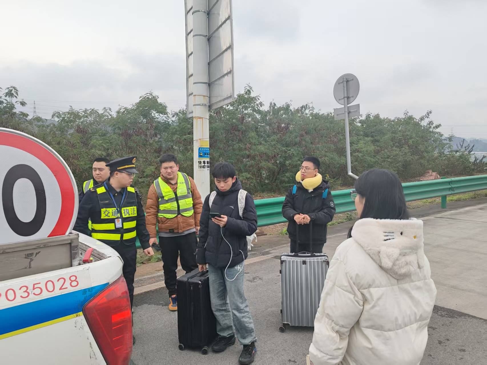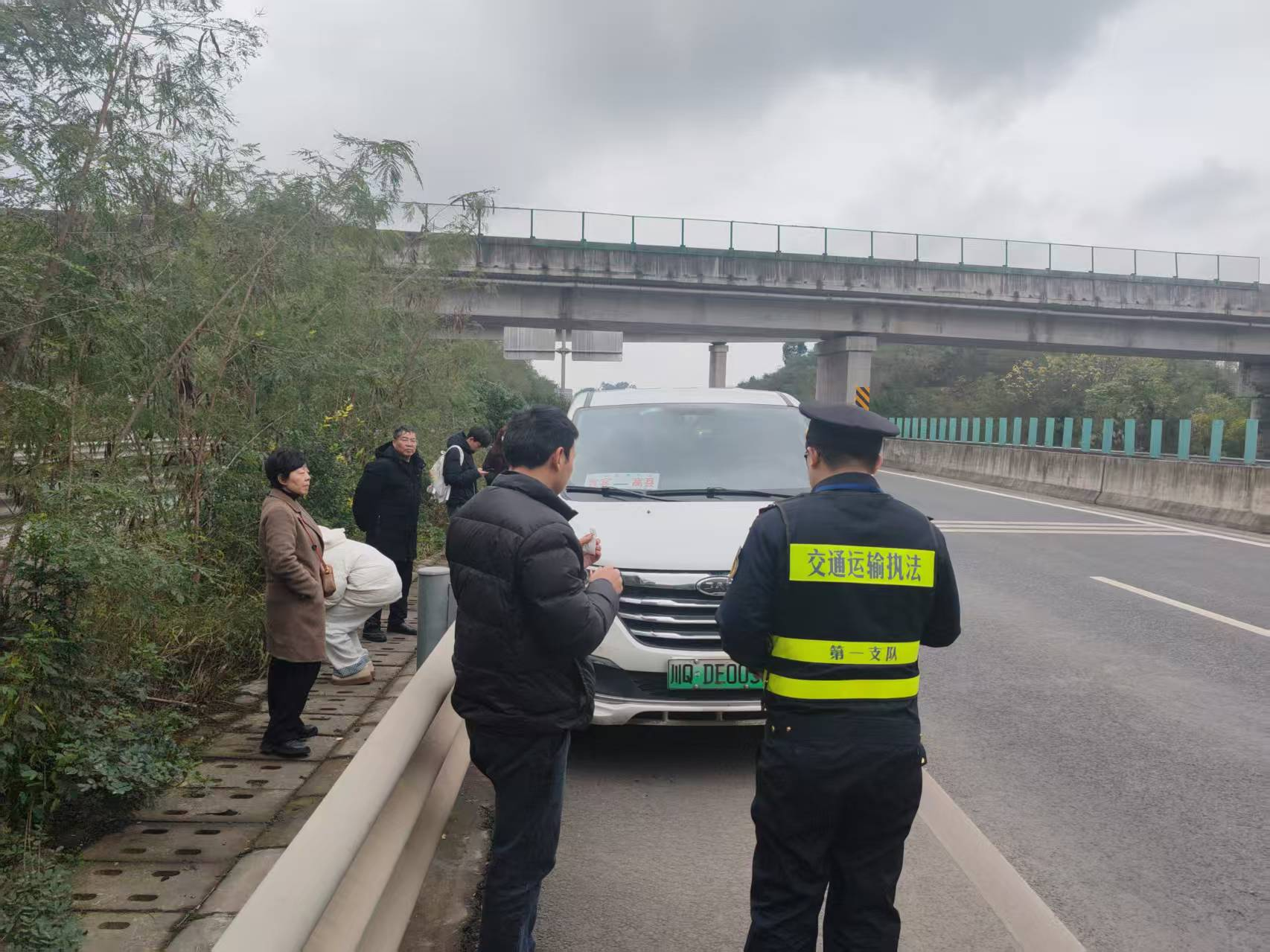 1月16日,交通执法一支队十三大队执法人员在S4成宜昭高速公路(宜彝段)巡查时发现一辆故障客车停在应急车道,司乘人员滞留,存在极大安全隐患。执法人员立即采取应急处置措施,及时将车上乘客全部安全疏散至护栏外侧区域,并同步联系营运公司救援队伍实施现场尾端布控。通过多方高效联动,有序组织乘客进行转移。仅用半小时,便在就近收费站顺利协助乘客换乘接驳车辆,有效消除了道路安全隐患,有力保障了高速公路的安全畅通。