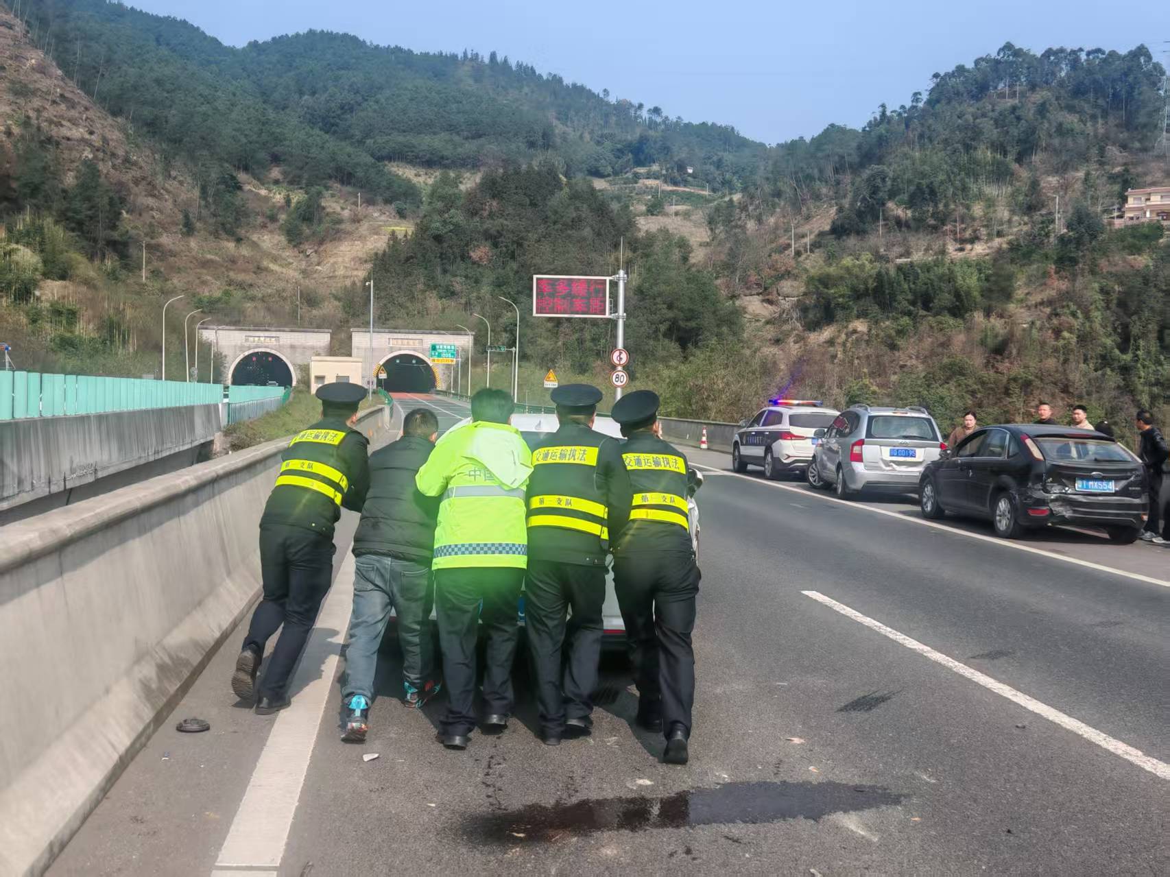 2月19日,交通执法一支队十一、十三大队执法人员在S4成宜昭高速公路宜彝段处置一起三车追尾的交通事故时,发现主线车流量非常大,故障车辆占用超车道,存在较大安全隐患。执法人员立即采取应急处置措施,在故障车辆后方设置安全警示标志,落实专人做好现场交通疏导、秩序维护等工作,并帮助驾驶员将车辆推到应急车道。同时,帮助驾驶员联系清排障救援服务单位进行施救处置,并将事故中感到不适的孕妇及时送医。执法人员的暖心助人行为受到司乘人员的一致赞赏。