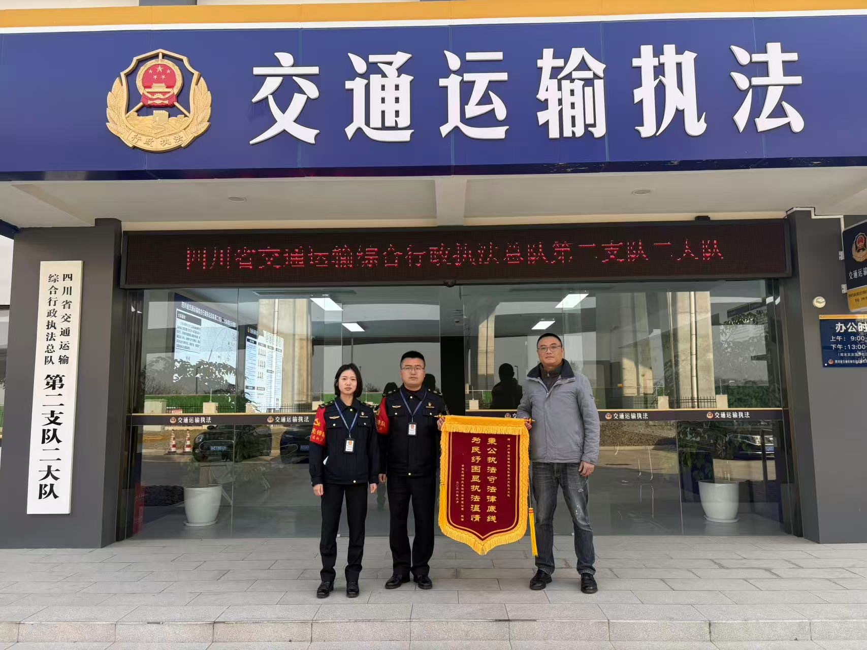 春运期间,交通执法二支队二大队加强辖区G0521汉蓉高速青白江收费站等重点路段巡查管控,查获一辆从江苏驶往成都青白江且已办理超限运输许可但未按许可方案落实全程护送的大件违法运输车辆。在执法过程中,执法人员坚持严格执法与温情释法相结合,现场开展普法教育并指导企业整改落实合规护送措施,同时依据川渝交通运输领域“五张清单”等规定依法大幅减轻行政处罚,既消除春运道路安全隐患,又切实为企业纾困减负。该暖心执法举措获安徽省一家大件运输企业专程送来锦旗致谢,彰显了执法为民的服务理念。下一步,大队将持续深化服务型执法,严守安全底线,全力守护春运大件运输安全畅通,营造安全有序、温暖贴心的春运通行环境。