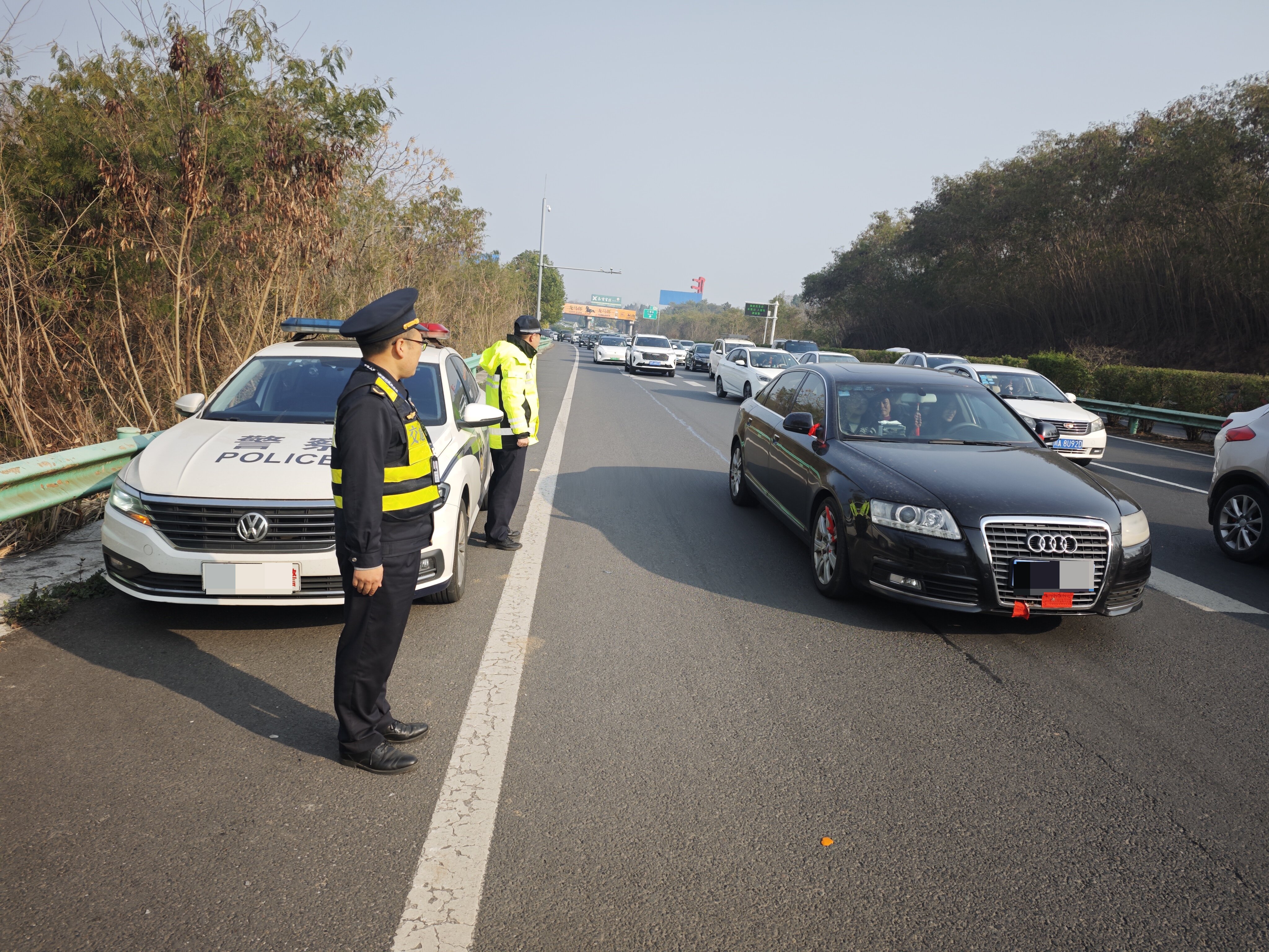 为营造安全畅通的高速公路通行环境,保障春节期间司乘人员出行顺畅,交通执法四支队三大队提前谋划、主动作为,全力做好道路保通保畅工作。一是强化现场管控,针对车流高峰,在匝道、互通立交等关键点位设置疏通渠化,规范行车路线,严防剐蹭事故;二是强化联勤联动,联合高速交警、营运公司建立“一路三方”机制,在易堵点设置临时值守岗,实行“一点一策”精准管控;三是强化宣传引导,利用沿线情报板滚动发布实时路况,并在拥堵路段启用无人机空中喊话,提醒司乘减速慢行、有序通行;四是强化高地协作,对接地方交通、应急等部门,建立信息共享与应急联动机制,快速处置各类突发事件。