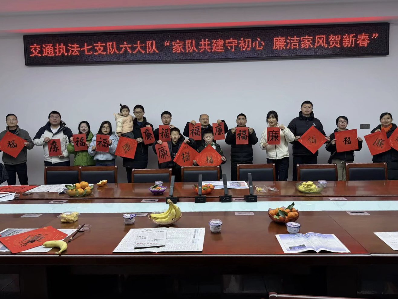 为进一步巩固“清廉交通·执法先锋”品牌建设成果,喜迎新春佳节,2月2日,交通执法七支队六大队邀请职工家属开展“家队共建守初心 廉洁家风贺新春”主题活动。通过开展座谈交流、参观执法站所、观看警示教育视频、共同书写春联等活动不断丰富家队共建新模式,搭建起“家”“队”之间的桥梁,促进干部职工感受大队驻地“家”的温暖,同时,把家庭成员发展为纪检组织的“延长线”,打通“八小时以外”监督的“最后一公里”,在新春佳节来临之际,共同营造风清气正的家风环境。