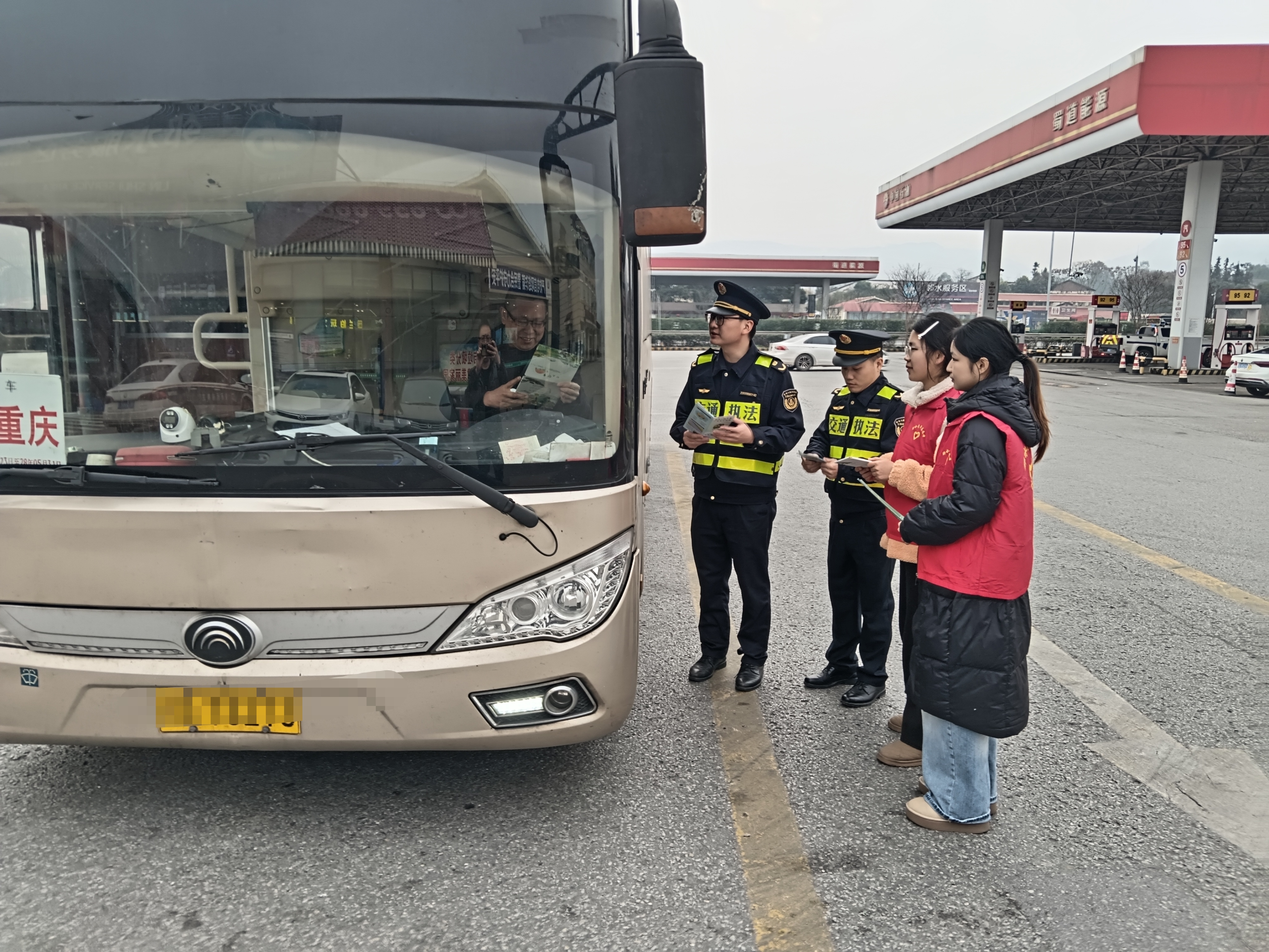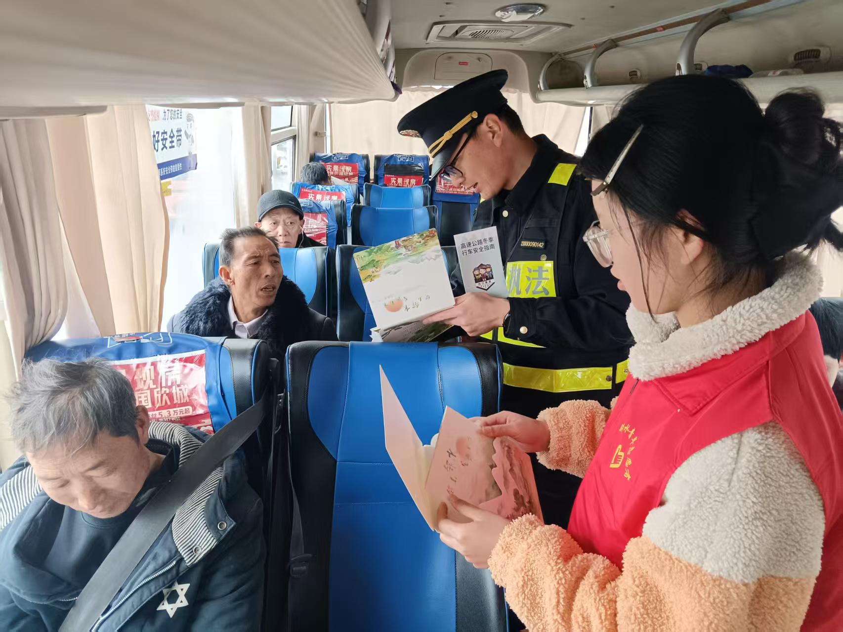 2月2日,2026年春运正式启幕,交通执法七支队四大队联合邻水县青年志愿者协会,在G65包茂高速公路达渝段邻水服务区开展“温馨春运 志愿护航”主题志愿服务活动。活动现场,大队与志愿者们向司乘人员发放平安出行手册、邻水县文旅宣传手册,细致讲解应急避险等平安出行知识和邻水特色美食与精品旅游线路,积极推介“远走不如进邻”的文旅名片,以暖心服务守护平安归途,以特色宣传传递邻水文脉,为过往旅客送上新春的关怀与祝福。