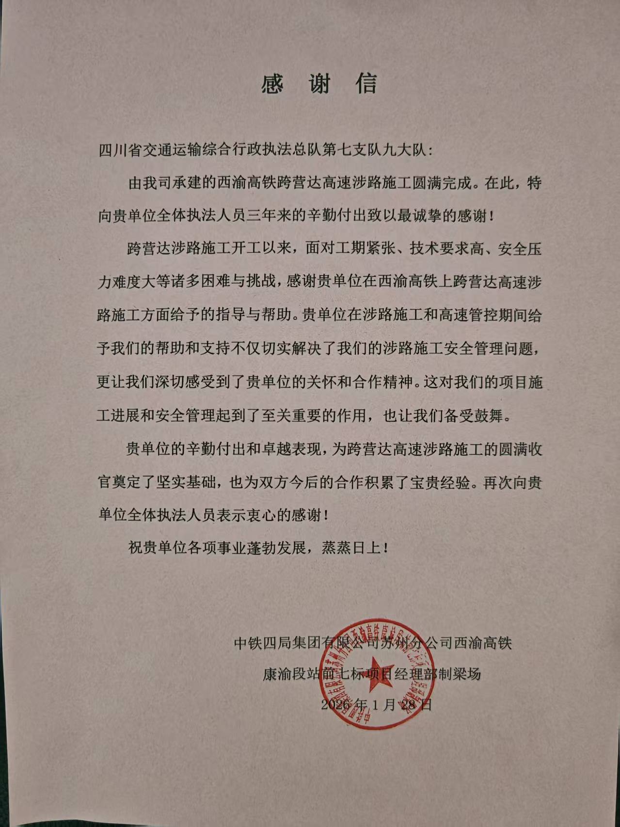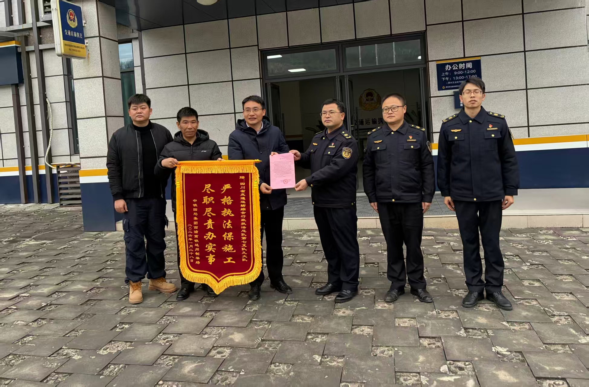 2月4日,中铁四局西渝高铁七标项目部到交通执法七支队九大队赠送锦旗和感谢信,感谢交通执法七支队九大队在西渝高铁上跨S26达阆高速公路营达段施工过程中给予指导和支持,帮助施工单位解决了诸多困难,确保了项目施工进展顺利,按预定计划圆满完成任务。项目部负责人充分肯定了执法人员三年来的辛勤付出,大队全体执法人员表示,在今后涉路(养护)施工监管过程中,将主动担当作为,切实履职尽责,做到监管与服务并重,确保辖区高速公路安全畅通。