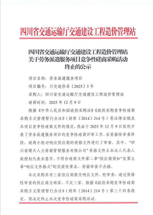四川省交通运输厅交通建设工程造价管理站关于劳务派遣服务项目竞争性磋商采购活动终止的公示