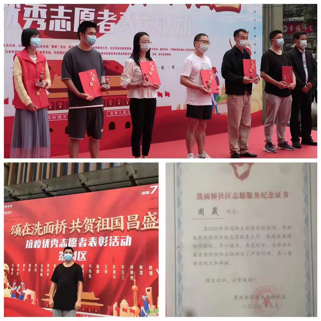 9月30日上午,成都市武侯区浆洗街街道洗面桥社区举行抗疫优秀志愿者表彰活动,对表现突出的志愿者进行嘉奖,四川省公路交通应急装备物资储备中心安全应急科党支部周晟同志获得表彰。