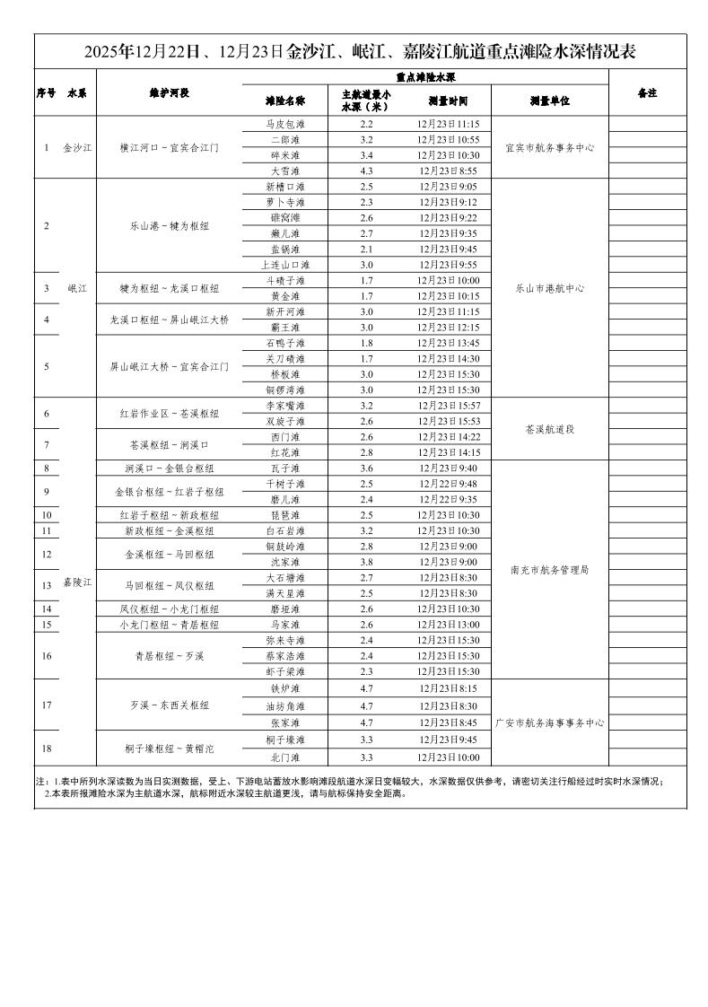 2025年12月22日、12月23日金沙江、岷江、嘉陵江航道重点滩险水深情况表