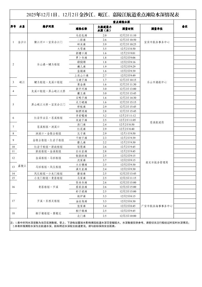 2025年12月1日、12月2日金沙江、岷江、嘉陵江航道重点滩险水深情况表