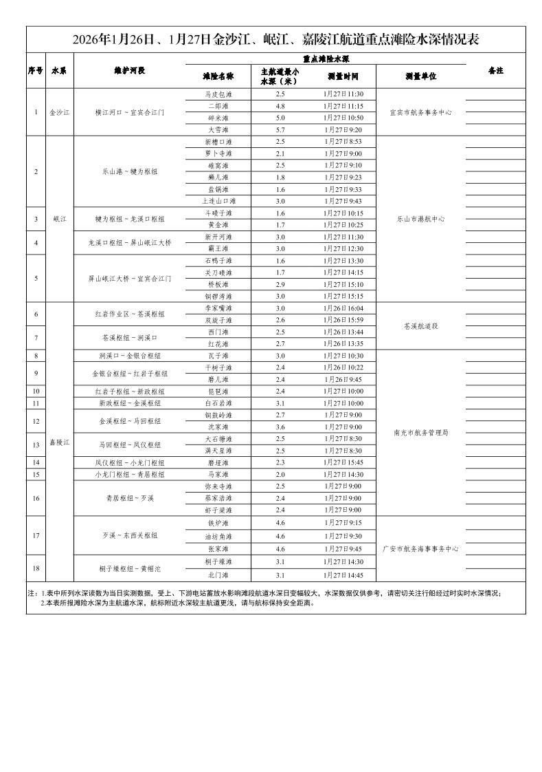 2026年1月26日、27日金沙江、岷江、嘉陵江航道重点滩险水深情况表