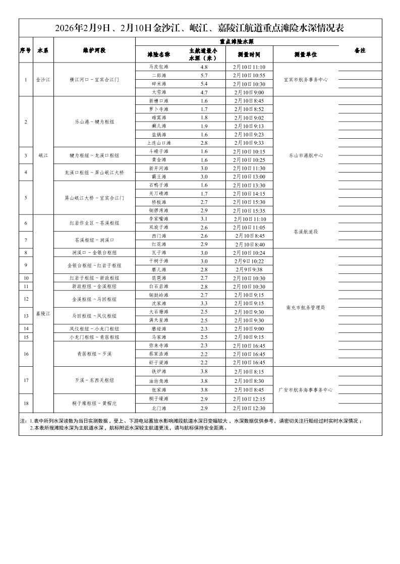 2026年2月9日、2月10日金沙江、岷江、嘉陵江航道重点滩险水深情况表