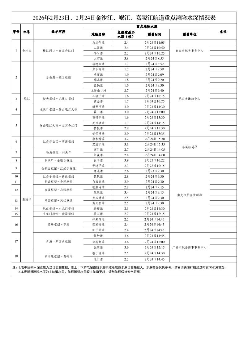2026年2月23日、2月24日金沙江、岷江、嘉陵江航道重点滩险水深情况表