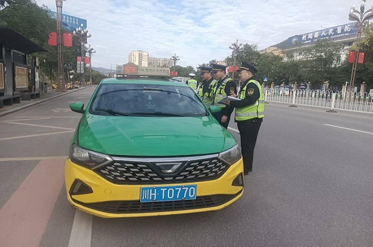 (在剑门关大道,交通执法人员依法对出租汽车开展监督检查,切实发现并纠正出租客运拒载、违规拼客等违法违规经营行为)