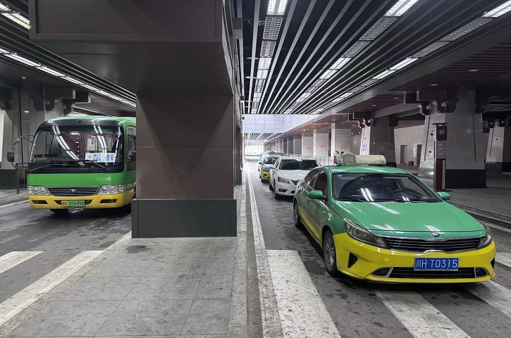 (在高铁站前接客区,参运车辆有序停放,确保游客接驳工作规范开展)