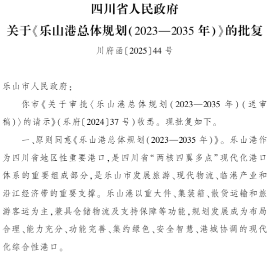 《乐山港总体规划(2023-2035年)》获省政府批复,为绿色港口建设明确规划蓝图。