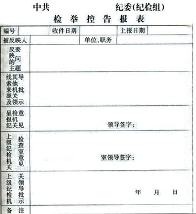 (三)地方和部门的纪委(纪检组)接到需上报的检举和控告后,应填写《检举控告报表》(格式附后),按月上报上一级纪委。问题比较重大或紧急的,随时上报。对上报的问题,需要进行初步核实和立案检查的,按照《案件检查工作条例》规定的程序进行。