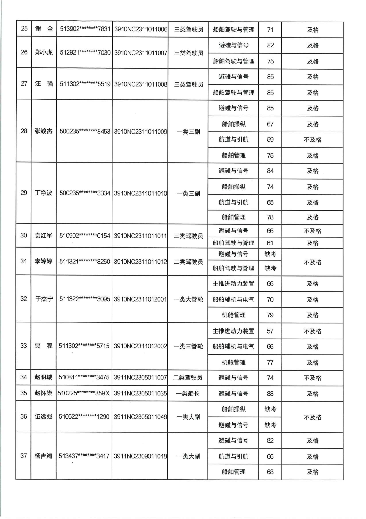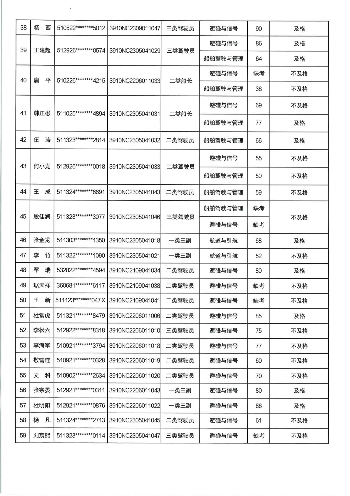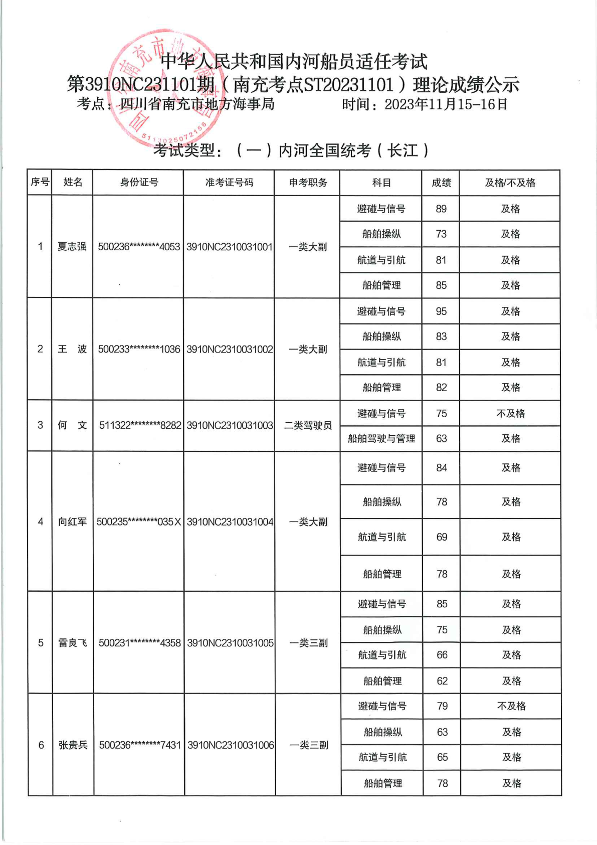 中华人民共和国内河船员适任考试第3910NC231101期(南充考点ST20231101期)理论成绩公示